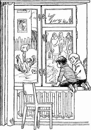 Валерка и Севка увидели, как какой-то человек выскочил из толпы и подбежал к будке телефона-автомата. Потом эту женщину занесли в парадное.