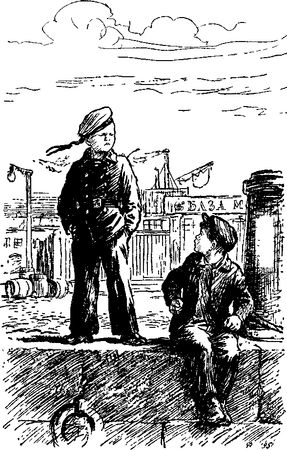 Вдруг Виктор вздрогнул, остановился, прикусил от неожиданности кончик языка и просветлел. За причальной тумбой, свесив ноги со стенки, сидел мальчик в чёрной курточке и в серой кепке. Услышав шаги Виктора, он обернулся, и юнга увидел вздёрнутый нос, маленькие серые глаза, вихры рыжих волос, выбившихся из-под кепки, - словом, он увидел своего вчерашнего противника.