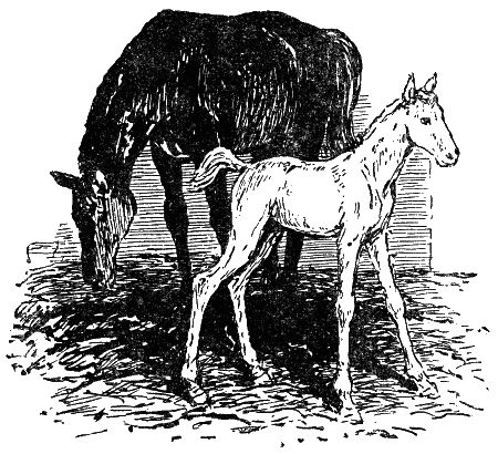 Увидя, что мать уводят из конюшни, жеребёнок сперва испугался страшно. Задрожал. Голову вскинул, тоненько и жалобно проржал что-то призывное. И тут же поскорее засеменил, застучал высокими ножками вдогонку.