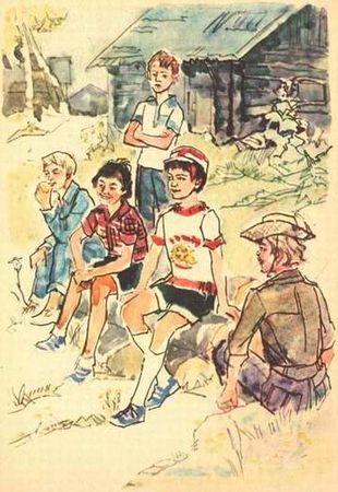 Я схватил пакет и, даже забыв поблагодарить старика, опрометью побежал на поляну. На ту поляну, откуда начиналась дорога на озеро. Там я сел на поваленную сосну и торопливо развернул пакет. В нем лежала картина. На темном вишневом небе застыла огромная зеленая луна. Луна, по которой никогда не ступала нога человека. Внизу, под горушкой, словно волшебное зеркало, серебрилось маленькое лесное озеро, похожее на запятую. А на берегу озера, рядом с камнем, чем-то походившим на дремлющего кота, виднелись две крохотные фигурки.