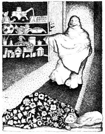 Фридер выпрыгивает из постели, несется на кухню, хватает скатерть, стягивает ее со стола и накидывает себе на голову. С громким криком "Ху-ху-ху-хууу, я - маленькое привидение!" он влетает обратно в детскую.