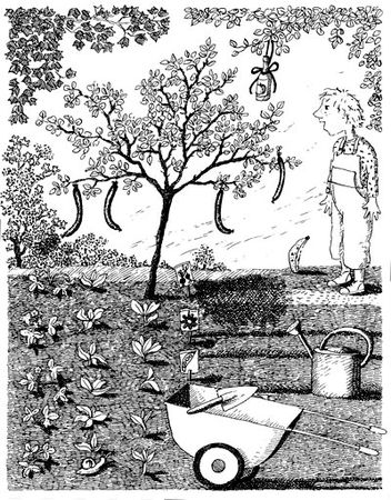 Вокруг стоят одни только тоненькие кустики. Когда-нибудь на них будут висеть ягоды, так сказала бабушка. Это будет крыжовник. Но как Фридер ни приглядывается, он не видит ни одной ягоды. А яблоня! На ней, конечно, есть уже много листьев, но яблок никаких, даже самых маленьких.
