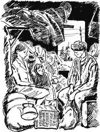 Возвращаются пассажиры, выходившие дышать воздухом. Возвращается дядя Федя. В одной руке у него бутылка топленого молока с коричневыми пенками. В другой - большая, румяная, великолепная картофельная шаньга. Он несет эти свои приобретения бережно и с достоинством, и, конечно, он недоволен, что его место занято.