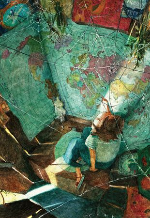 Стены были скрыты до самого верха красивыми крышками от тортов и конфетных коробок, которые когда-то надарили бабушке с дедушкой, а на всю заднюю стену, заходя на боковые, горделиво раскинулась карта мира. Часто, забежав в туалет, Велька подолгу засиживался, рассматривая причудливые очертания материков, скользил пальцами по тугим изгибам меридианов, считал россыпи островов, и от чужих названий запинался и уставал язык.