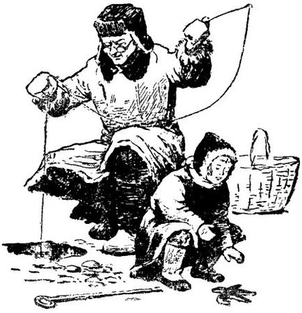 Рыбаки группами и поодиночке перебегали с места на место. Поминутно подёргивая палочку с леской - удочки для подлёдного лова очень коротенькие, - они тревожно оглядывались по сторонам, не клюёт ли у соседа лучше. Когда кто-нибудь вытаскивал одну рыбку за другой, к нему сбегались со всех сторон и начинали быстро вертеть коловоротами лунки: значит, в этом месте проплывал косяк.