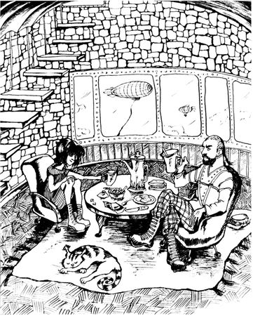 Комнатка была маленькой, но очень уютной. Стены были из серого кирпича, а пол деревянный. Посередине лежал зелёный ковёр, на нём стоял небольшой стол, рядом со столом было два кресла, на которых сидели Триша и её папа – пилот Джа. Они пили чай с бутербродами.