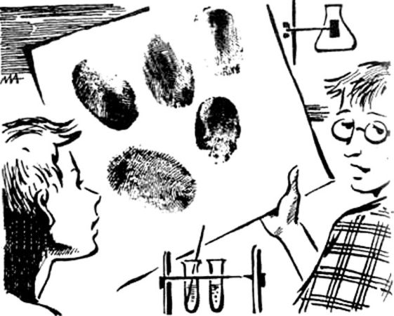 - Ну это же увеличение. Так вот, я и Очкарик побывали сегодня утром в лесу и посыпали порошком, который настоящие сыщики всегда носят при себе, поверхность всех гладких предметов в хижине. На них проступили все отпечатки пальцев, понимаешь! Особенно много их было на жестяной банке. Прошлой ночью мы все держали ее в руках.