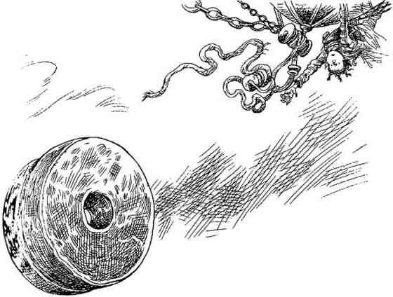 Дрожа от волнения, Прутик прополз еще и с трудом потянул за трос. Противовес должен висеть свободно. Если только он сможет… Он продвинулся еще немного вперед и потянул за огромный узел. Неожиданно тот поддался, противовес качнулся… и оторвался совсем! Прутик замер в ужасе, когда огромный металлический диск полетел вниз - в лес, над которым парил "Громобой".
