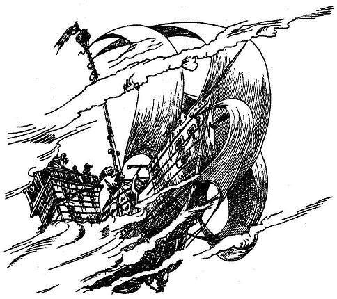 В тот же миг рулевое колесо завертелось вихрем и мальчик покатился по палубе. На "Громобое" моментально сникли паруса, и корабль начал снижаться, подхваченный вращением.