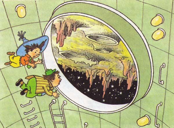 Как только ракета замедлила ход, начались перегрузки, и возникшая сила тяжести прижала Незнайку и Пончика к полу кабины. Незнайке всё же не терпелось узнать, что произошло с Луной. Дотащившись на четвереньках до стенки кабины и с трудом поднявшись на ноги, он заглянул в боковой иллюминатор.