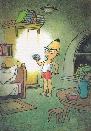 Не сказав ни слова, Знайка положил камень на подоконник и в глубокой задумчивости лёг в постель.