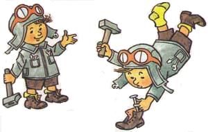 - Блестящая мысль! - обрадовался Винтик. Друзья быстро приколотили к полу два стула. Теперь, когда их ноги приобрели сцепление с полом, забивать гвозди стало легко.