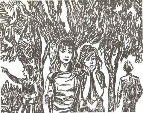 Все четверо застыли в ожидании. Они ждали появления звезд, при свете которых хоть что-то будет видно. Но, к несчастью, небо затянуло облаками. И только изредка, в просветах между ними, вспыхивали одинокие звездочки. Спустя несколько минут ребята постепенно привыкли к темноте и даже решились сделать несколько шагов в неизвестном направлении. Внезапно Джек заметил, как за деревом шевельнулась темная тень.