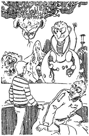 "Все остальные" были группой из восьми инопланетян, расположившихся широким полукругом. Некоторые сидели, некоторые стояли; один свисал с потолка вниз головой, а другой растянулся на подпорках, поддерживавших его пурпурные щупальца. На вершине конструкции располагались два раструба, время от времени выпускавшие сиреневый туман, который сохранял щупальца влажными и блестящими.