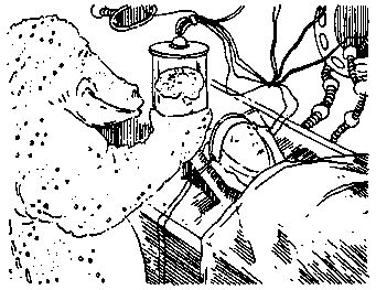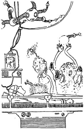 - Твой мозг по-прежнему соединен с телом,- сказал Крок-Док. Он снова поднял банку и указал на ее днище.- Видишь эти провода? Они ведут к твоему черепу и обеспечивают контакт с нервными окончаниями. Я буду отсоединять их каждый раз, когда мы соберемся провести эксперимент, который может причинить тебе неудобства. Но в промежутках ты сможешь присоединяться к нам.