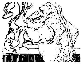 Когда я снова открыл глаза, то обнаружил, что лежу в комнате, освещенной спокойным зеленоватым сиянием. Я по-прежнему оставался голым. Высокий инопланетянин, подозрительно напоминавший земного крокодила (если бы крокодилы были красными, а не зелеными), горой возвышался надо мной.
