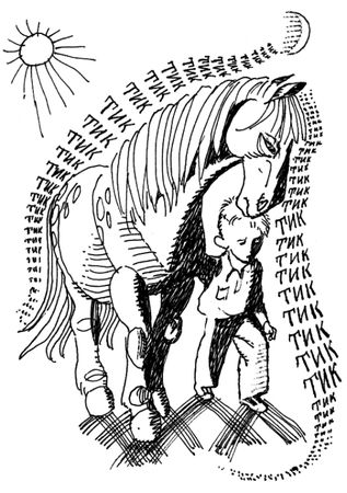 Елизавета Елизаровна не отрываясь глядела на дорогу, которая вела через луг к реке. А мама ходила взад и вперёд, от кривой сосны до пенька и обратно. Елизавета Елизаровна держалась за щёку, как будто у неё только что вырвали зуб.