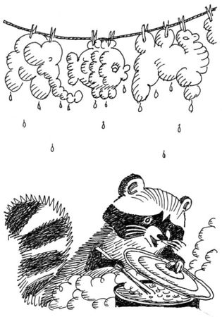 Развесив всё, енот ещё раз тяжело вздохнул и направился к баку. При его приближении крышка сама поднялась, и он стал мешать кипящее бельё чисто обструганной палочкой.