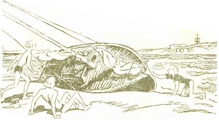 Когда волны откатились, "Бернар" лежал на боку. Шпангоуты треснули, а великолепная красная краска во многих местах была начисто содрана. Не исключено, что и мотор поврежден, ведь его залило водой. В каюте плавал фотоаппарат. Прямо хоть плачь.