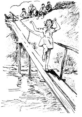 Он подошел к переходу, постоял немного на левой ноге и прыгнул на доски мостков. "Главное - не смотреть вниз", - твердил он про себя, но все же на середине мостков глянул на воду. Покачнулся, но, стоя на одной ноге, удержал равновесие, поскакал дальше. Вот и берег!