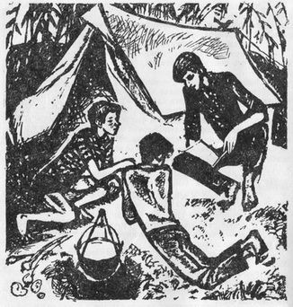 Он пошлёпал лопаткой по краям своего колодца, и мы отправились к палатке. Наш учёный секретарь лежал на траве и что-то рисовал. Я посмотрел через его плечо и невольно ахнул: так хорошо получилось озеро, особенно камыши. Я вспомнил свою тройку по рисованию и попросил Юру научить меня рисовать.