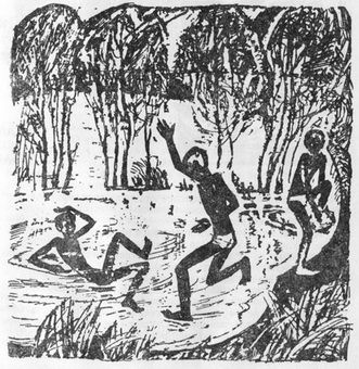 Вытащил свой альбом и сел рисовать. Я примостился около. Юра несколькими штрихами нарисовал фигуру Бори, склонившегося над котелком, и начал отделывать. Я невольно фыркнул: до того смешно Боря раскорячил перед котелком ноги.