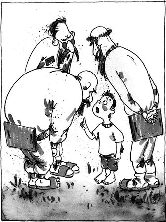 Когда мы вышли из мастерской на солнце, папа посмотрел на нас и показал пальцем в сторону палаток: переодеваться немедленно! Динки с ним не было.