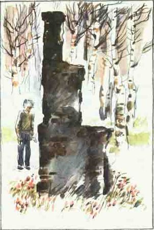 В центре зелёной весёлой полянки стояла труба. Лёшка подошёл поближе и увидел, что это печь. Такая, как была в доме у деда Клавы, такая, как в той деревне на Владимирщине, где родился сам Лёшка. Только те печи были белёные, иногда с голубым изразцовым бордюром, а эта была чёрная, словно обгоревшая. Вокруг неё пламенели искусно посаженные тюльпаны.