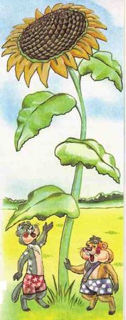 Обнаружил он как-то на Дальнем поле необыкновенное растение. Высокое-высокое. С толстым коричневато-зелёным стволом. А вверху - бархатистая жёлтая шляпа с золотистыми лепестками.
