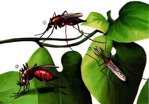 Комар-аедес 2. Комар-кулекс (сверху) 3. Комар-кулекс (сбоку)
