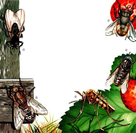 1. Мошка 2. Овод 3. Полевая муха 4. Слепень 5. Комар