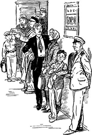 И я снова стал в очередь. Но уж не к окошку, а в самый-самый конец. И по всем правилам, как требовал милиционер, прижался к стене. А еще я прижался и даже слегка пригнулся для того, чтобы не слишком вылезать вперед и не попадаться на глаза милиционеру. Но он, прохаживаясь перед очередью, как полководец перед строем, все же заметил меня: