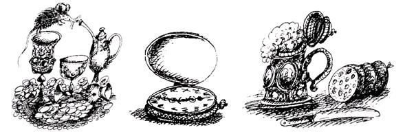 "Вот здесь я и останусь, - подумал бургомистр. - Какой славный беспорядок! Мы, мыши, просто обожаем, когда кругом такой замечательный беспорядок. Какая чудесная кухня! А что это за ноги шаркают туда-сюда? Женские ноги в рваных тапочках". Потом он услышал стук выдвигаемого ящика и звяканье глиняной посуды. А затем ему прямо под нос вдруг подсунули мисочку с двумя кусочками шпика.