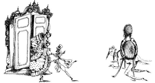 Но Осторожинка спокойно шла, продолжая петь свою грустную песенку, пока наконец не дошла до королевского дворца, где все придворные при виде чудовища дружно забились под золотые стулья, а также позолоченные шкафы. Все, за исключением короля.