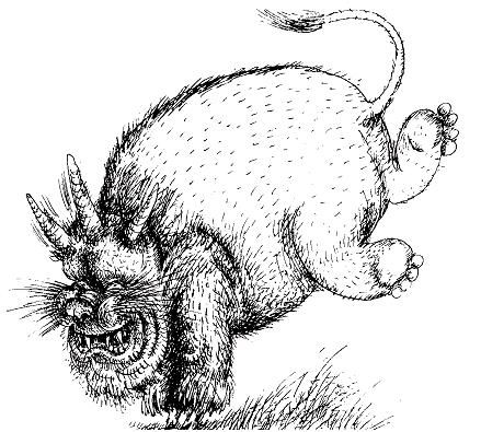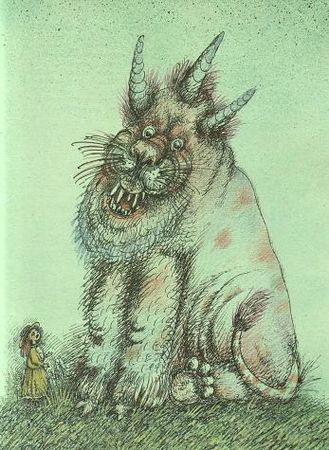 Осторожинка медленно подняла голову и увидела все его туловище - гигантское туловище - даже больше, чем у слона! - покрытое густой лохматой шерстью. Потом она откинула голову назад и увидела морду чудовища. И это, надо сказать, было самое жуткое зрелище! У него было три рога и широко распахнутая пасть со множеством острых зубов. Усы у него были, как у тигра, а нос он морщил, как драчливый пес. Его маленькие глазки полыхали лютой злобой. Он пыхтел, как паровой котел, и лязгал своими страшенными зубами. Было ясно, что он твердо намерен слопать Осторожинку целиком и даже портфеля от нее не оставить.