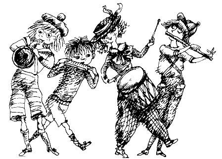 И звучание трубы так поразило мальчика, что он доиграл всю песенку до конца, а потом заиграл новую, а потом еще и еще одну. И другие дети побросали свои игрушки и стали слушать мальчика. Некоторые из них сбегали домой и принесли - кто флейту, кто губную гармошку, кто барабан. И не успело еще кончиться утро, как у детей сложился чудесный оркестр, и играли они с таким вдохновением, что все прохожие останавливались и аплодировали им.