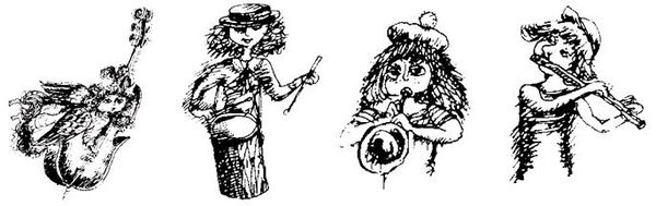Мальчик провожал ангелочка взглядом, пока тот не превратился в точку и не исчез среди облаков. Мальчик на прощание дунул в трубу, и вскоре со всех сторон сбежались дети с разнообразными музыкальными инструментами. Они хотели играть.