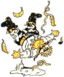 Тогда Джек выбрался из мучного ларя, вскарабкался по ножке стола, схватил арфу и пустился наутек. Но когда он перескакивал через порог, арфа громко зазвенела и позвала: "Хозяин! Хозяин!" Великан проснулся и выглянул за дверь.