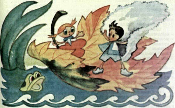 Оба изо всех сил принялись грести руками. Только течение было сильнее их. Оно всё быстрее и быстрее несло беспомощный листок к водопаду.