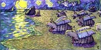 Через несколько дней увидели мы впереди незнакомый остров и решили немного поваляться на траве. Сошли на берег. Трава и в самом деле была мягкая и душистая. Мы улеглись в нее, и каждый стал думать, о чем он хочет: Гридиг – о своей Гридиане, я – о своем доме, Крэг – о Кутенейских горах, а Наша Добрая Змея – о теплом абажуре настольной лампы.