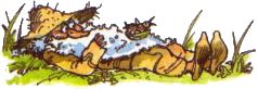 Внезапно пар над озером рассеялся, и лучи заходящего солнца залили окрестности ярким светом. Полботинка и Муфта с ужасом увидели, что на них мчится стая озверевших кошек.