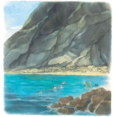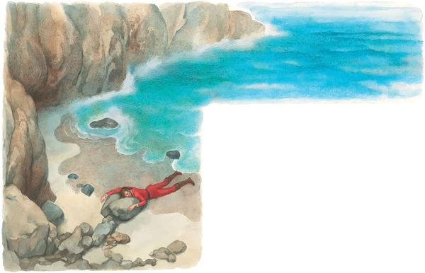 Наконец она завидела твёрдую землю и высокие, уходящие в небо горы, на вершинах которых, точно стаи лебедей, белели снега. У самого берега зеленела чудная роща, а над ней высилась то ли церковь, то ли монастырь – она не знала толком, что это. В роще росли апельсинные и лимонные деревья, а у ворот здания – высокие пальмы. У входа в тихую, но глубокую бухту стоял утёс, возле которого море намыло мелкий белый песок; вот сюда-то и приплыла русалочка и положила принца на берег, позаботившись о том, чтобы голова его лежала повыше и на самом солнце.
