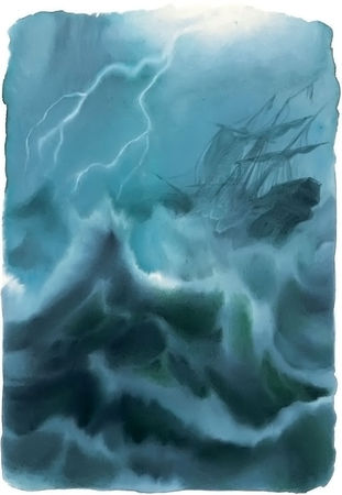 Становилось уже поздно, но русалочка глаз не могла оторвать от корабля и от красавца принца. Разноцветные огоньки потухли, ракеты больше не взлетали в воздух, не слышалось и пушечных выстрелов, зато загудело и застонало само море. Русалочка качалась на волнах рядом с кораблём и всё заглядывала в каюту, а корабль стал набирать скорость, паруса развёртывались один за другим, ветер крепчал, волны всё нарастали, облака спустились, и где-то вдали засверкала молния. Начиналась буря! Матросы принялись убирать паруса; огромный корабль страшно качало, а ветер так и бросал его из стороны в сторону; вокруг корабля вздымались высокие валы, словно чёрные горы, грозившие сомкнуться над мачтами корабля, но он нырял между водяными стенами, как лебедь, и снова взлетал на гребни волн.