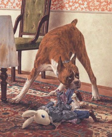 Вот так и текли дни Эдварда – один за другим, и ничего особенно примечательного не происходило. Конечно, порой случались всякие события, но они были местного, домашнего значения. Однажды, когда Абилин ушла в школу, соседский пёс, пятнистый боксёр, которого почему-то звали Розочкой, явился в дом без приглашения, практически тайком, задрал лапу у ножки стола и описал белую скатерть. Сделав своё дело, он потрусил к стулу перед окном, обнюхал Эдварда, и кролик, не успев решить, приятно ли, когда тебя обнюхивает собака, оказался у Розочки в пасти: с одной стороны свисали уши, с другой – задние лапки. Пёс яростно тряс башкой, рычал и пускал слюну.