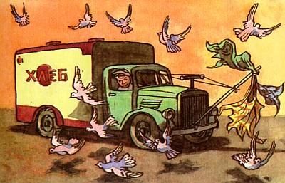 Грузовик сердито фырчал мотором, пыхтел. А голуби важно расхаживали по мостовой перед колёсами и никуда не спешили. Тогда из кабины выскочил недовольный человек в белом халате, замахал руками: