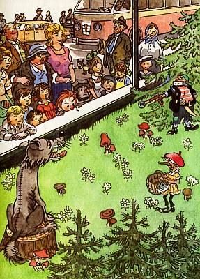 Разбойники выскочили через какую-то дверь на улицу. Но, оказывается, это была совсем не улица. Перед ними стояла игрушечная Красная Шапочка. Серый Волк хитро поглядывал на них и скалил зубы.