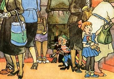 Разбойники, толкая покупателей, бросились догонять Карандаша и Самоделкина. Но попробуй догони кого-нибудь в магазине! Кругом люди. Все идут в разные стороны, спешат.