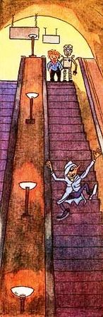 Где-то наверху, на земле, рано утром подошёл к станции Монтёр. Он вынул из кармана ключи и стал отпирать большие двери как раз в ту минуту, когда Самоделкин и Карандаш бежали по лесенке наверх, перескакивая со ступеньки на ступеньку. (По ночам лесенки в метро сами не двигаются.)
