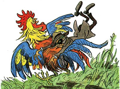 Он поманил петуха пальцем. Гордый петух и не думал подходить. Разбойник сделал вид, что сыплет на землю какие-то крошки.