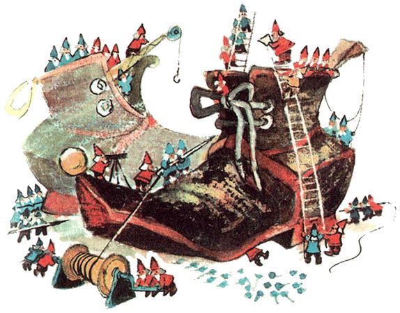 С любопытством смотрели они, как гномы шили Арахне огромные башмаки, и восхищались их ловкостью и трудолюбием. Страшила и прочие интересовались также и тем, что происходило в долине Марранов и у Мигунов. Там после победы над злой волшебницей всё уже пришло в порядок, и каждый занимался своим делом.